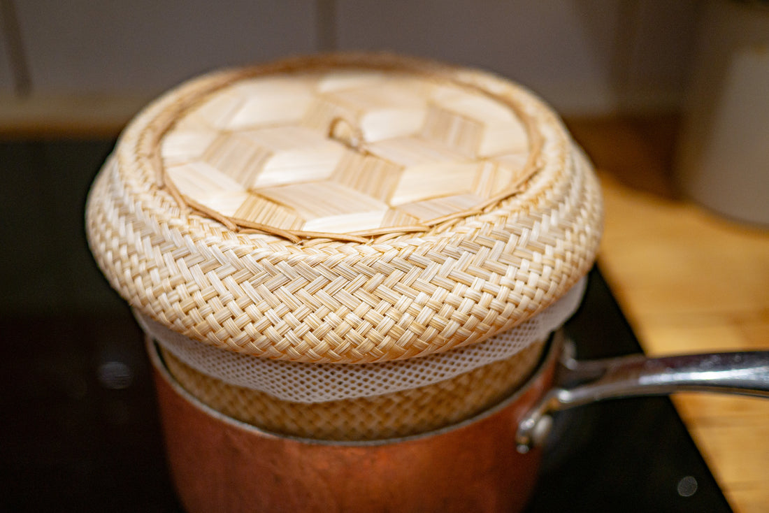 Usually paired with an aluminium steaming pot, this basket elevates the rice above the boiling water, allowing it to cook with indirect steam. The open weave of the bamboo helps circulate steam while preventing water from collecting at the bottom of the rice.